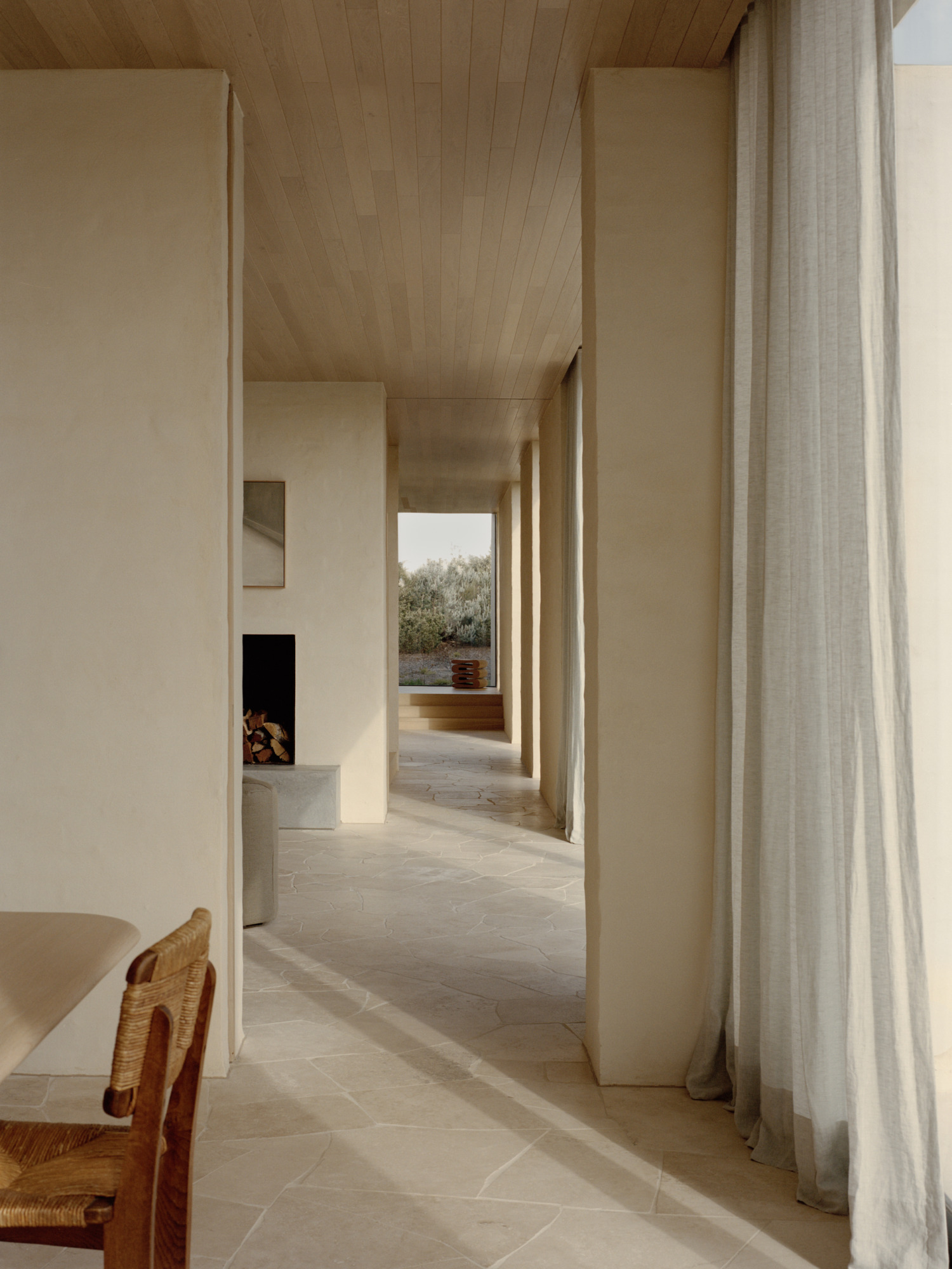 Pandolfini Architects designed Wildcoast House as a family retreat that balances openness with protection and community with solitude, responding to its rugged Victorian coastal setting. Rough masonry, timber screens, and landscaped mounds allow the home to feel as though it has grown from the land, while layered interiors unfold from a cave-like entry into bright, tactile spaces. The robust material palette, including textured render, travertine paving, and Cloud 90s boards, which have been used to timber-line the ceilings, brings the landscape indoors and ensures the house wears in gracefully with everyday life.
